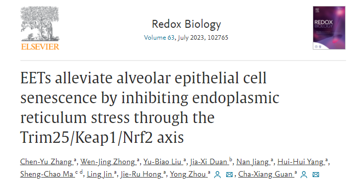 2023年6月2日,p站视频 基础医学院管茶香教授团队在国际权威学术期刊《氧化还原生物学》(Redox biology,中科院一区TOP期刊)发表了题为“EETs alleviate alveolar epithelial cell senescence by inhibiting endoplasmic reticulum stress through the Trim25/Keap1/Nrf2 axis(EETs通过Trim25/Keap1/Nrf2轴抑制内质网应激减缓肺泡上皮细胞衰老)”的研究论文。p站视频 基础医学院生理学系为第一及通讯作者单位,基础医学院管茶香教授和周勇副教授为本文的共同通讯作者,2020级博士生张晨宇为第一作者。