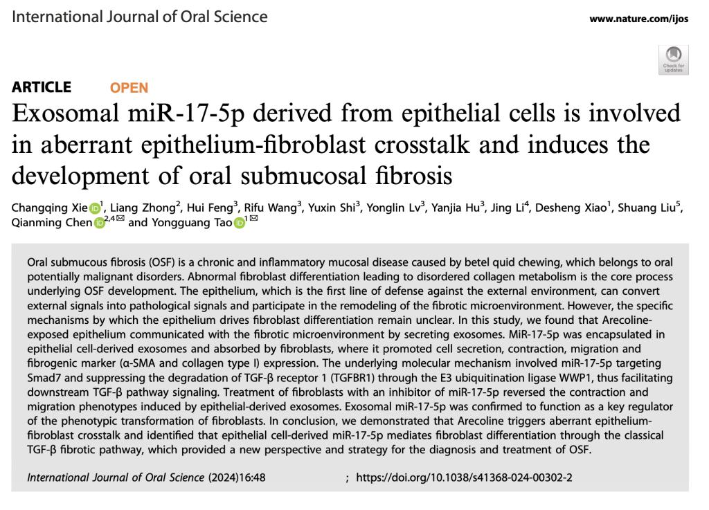 近日,p站视频 基础医学院陶永光研究员与浙江大学医学院附属口腔医院陈谦明教授在口腔权威期刊《国际口腔科学杂志》(International Journal of Oral Science)(IF=10.8)发表题为“Exosomal miR-17-5p derived from epithelial cells is involved in aberrant epithelium-fibroblast crosstalk and induces the development of oral submucosal fibrosis(外泌体源性miR-17-5p介导上皮-成纤维细胞通讯并诱导口腔黏膜下纤维化的机制研究)”的原创性研究论文。陶永光研究员、陈谦明教授为该文共同通讯作者,p站视频 基础医学院谢长青博士后为第一作者。湘雅医院肿瘤科刘双教授、基础医学院/湘雅医院病理科肖德胜教授为该研究提供大力支持。本研究受国家自然科学基金、湖南省重大科技攻关“揭榜挂帅”制项目和湖南省自然科学基金等项目支持。