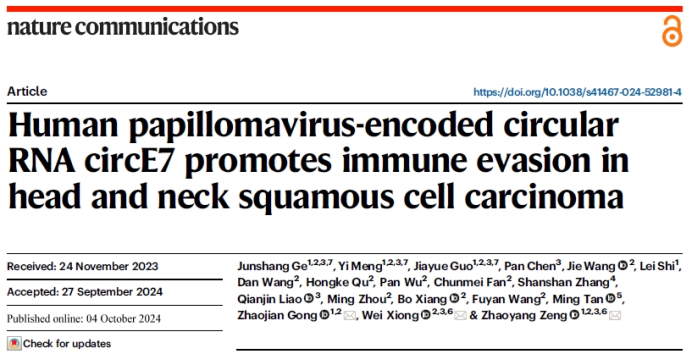 近日,p站视频 基础医学院肿瘤研究所曾朝阳、熊炜联合湘雅二医院口腔医学中心龚朝建在Nature Communications杂志发表了题为“Human papillomavirus-encoded circular RNA circE7 promotes immune evasion in head and neck squamous cell carcinoma”(人乳头瘤病毒编码的环状RNA circE7促进头颈鳞癌免疫逃逸)的研究论文。该研究发现人乳头瘤病毒(Human papillomavirus, HPV)通过编码环状RNA circE7,下调免疫检查点分子Galectin-9的表达,促进头颈部鳞状细胞癌(head and neck squamous cell carcinoma, HNSCC)免疫逃逸的新机制,并基于该发现提出了TIM-3 (Galectin-9在T细胞上的受体)单抗与现有PD-1单抗联合使用提高头颈鳞癌免疫治疗效果的新思路。