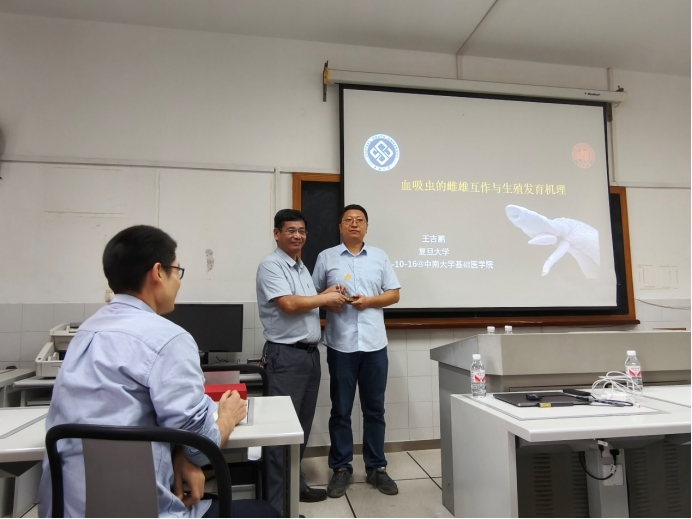 2024年10月16日,复旦大学王吉鹏教授受我院医学寄生虫学系邀请来院开展学术交流活动,并作学术报告“血吸虫的雌雄互作与生殖发育机理”。此次活动由医学寄生虫系黄静副教授主持,学院师生积极参加,孝骞楼352会议室座无虚席。