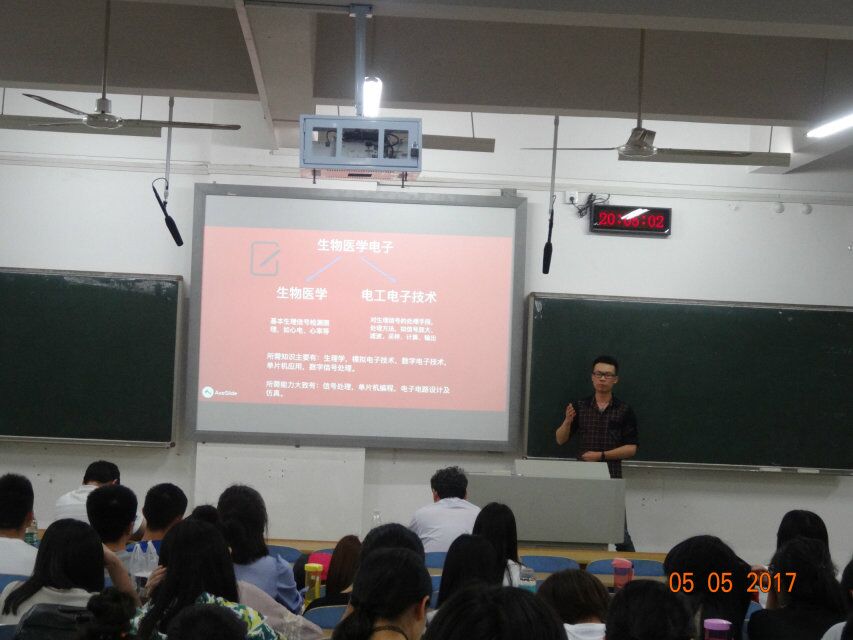 首先,徐效文老师做了题为“如何准备生物医学电子创新设计竞赛”的专题讲座,就全国生物医学电子创新设计竞赛的基本情况、2017校赛参赛要求以及竞赛安排等事项、大赛亟待解决的问题、历年国赛题目等方面进行了详细的讲解。生物医学电子创新设计竞赛是为推动我国生物医学工程学科的发展、促进生物医学电子技术的进步、培养高水平的优秀专业人才而举办的全国性大型学生竞赛。竞赛主题主要包括嵌入式系统技术、传感器技术、无线射频网络技术、模拟电路及数字电路技术、医学信号获取与处理、电子信息技术等在生物医学领域的应用。近年来p站视频 在该项竞赛中取得了骄人的成绩。2014年首届全国生物医学电子创新设计竞赛p站视频 获得二等奖1项,2016年第二届全国生物医学电子创新设计竞赛p站视频 获得一等奖1项,二等奖2项,三等奖1项。