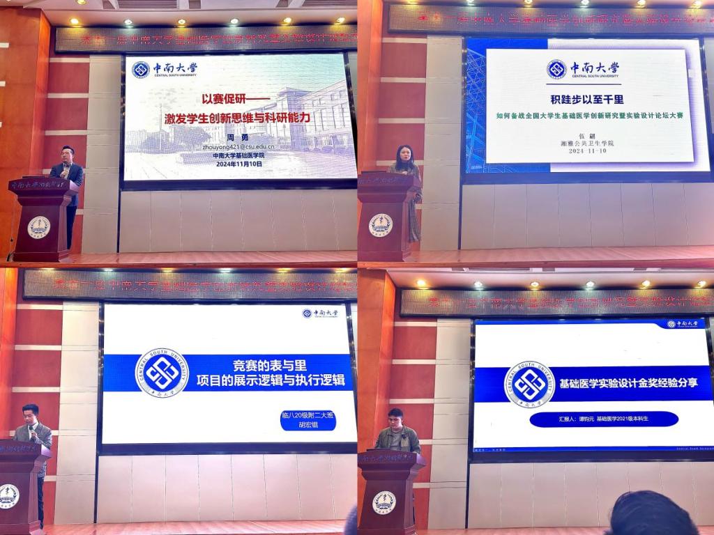 2024年11月10日上午9:00,第十一届p站视频 基础医学创新研究暨实验设计论坛宣讲会在湘雅医学院福庆楼四楼学术报告厅顺利召开。会议邀请了湘雅医学院曾艺副院长出席,湘雅公共卫生学院伍翩老师为同学们备赛提供指导建议,胡宏锟和谭钧元两位金奖得主分享获奖经验。会议由基础医学院副院长周勇主持。