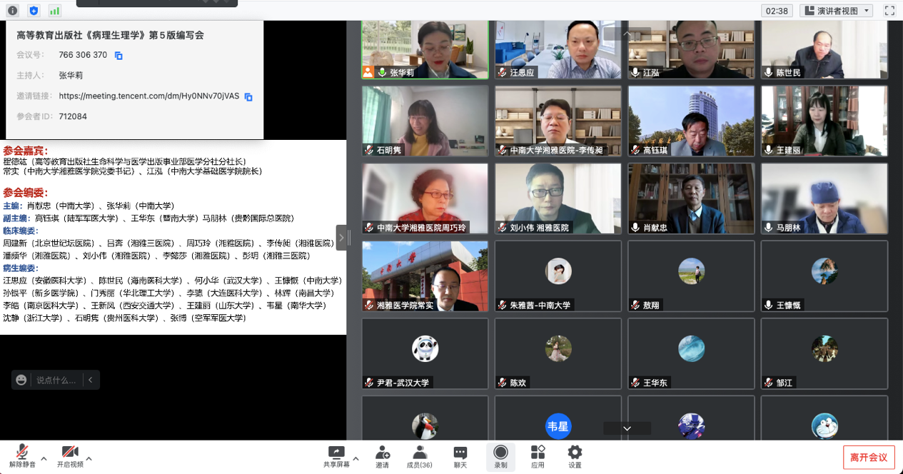 “十二五”普通高等教育本科国家级规划教材、高等学校“十四五”医学规划新形态教材《病理生理学》(第5版)编写会于2023年1月8日线上顺利召开。该教材由p站视频 基础医学院肖献忠教授和张华莉教授担任主编,陆军军医大学高钰琪教授、暨南大学王华东教授、贵黔国际总医院马朋林教授担任副主编。高等教育出版社生命科学与医学出版事业部医学分社分社长瞿德竑责任编辑以及28位编委(包括9名临床编委)出席会议。