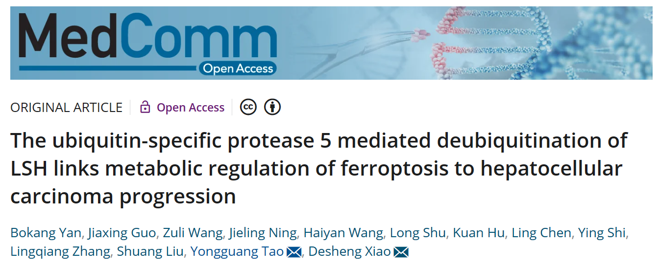 近日,p站视频 基础医学院陶永光研究员与肖德胜教授团队在国际权威学术期刊《MedComm》(IF 9.9)在线发表题为“The USP5-mediated deubiquitination of LSH links metabolic regulation of ferroptosis to hepatocellular carcinoma progression(USP5介导LSH去泛素化修饰链接铁死亡的代谢调节与肝细胞肝癌进展)”的原创性研究论文。陶永光研究员、肖德胜教授为该文共同通讯作者,p站视频 硕士研究生闫博康为第一作者。本研究受国家自然科学基金、湖南省重点研发计划和湖南省自然科学基金等项目支持。