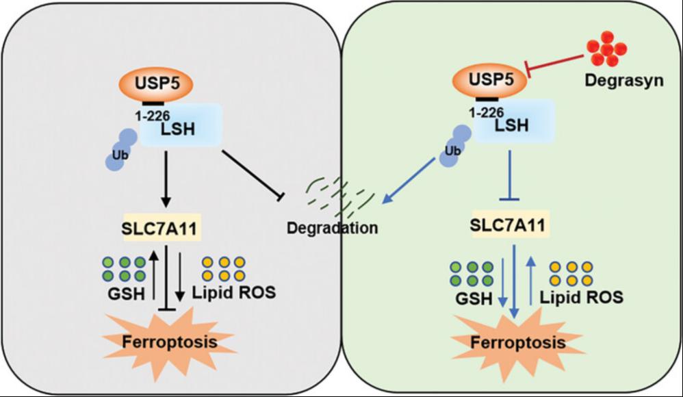 在该研究中,研究团队首次揭示USP5通过去泛素化修饰稳定LSH。同时USP5可通过稳定LSH,上调SLC7A11的表达进而抑制肝癌细胞铁死亡。使用小分子抑制剂Degrasyn可靶向USP5显著抑制肝癌进展,提示 USP5 具有发展成为 HCC 新治疗靶点的潜力,对肝癌治疗策略的丰富具有重要意义。