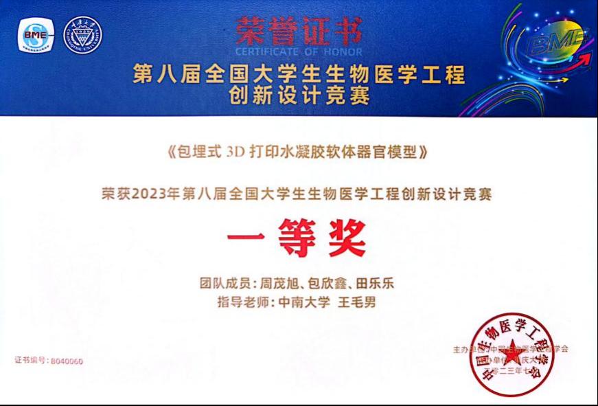 7月21日至23日,第八届全国大学生生物医学工程创新设计竞赛决赛在重庆大学举行,p站视频 基础医学院组织学生参加了此次比赛,并取得优异成绩。周茂旭、包欣鑫、田乐乐3位同学设计的参赛作品《包埋式3D打印水凝胶软体器官模型》荣获自选项目本科生组全国一等奖,指导教师为病理学系王毛男老师。此外,我院生医系肖嘉莹老师指导团队获得命题项目组全国三等奖。