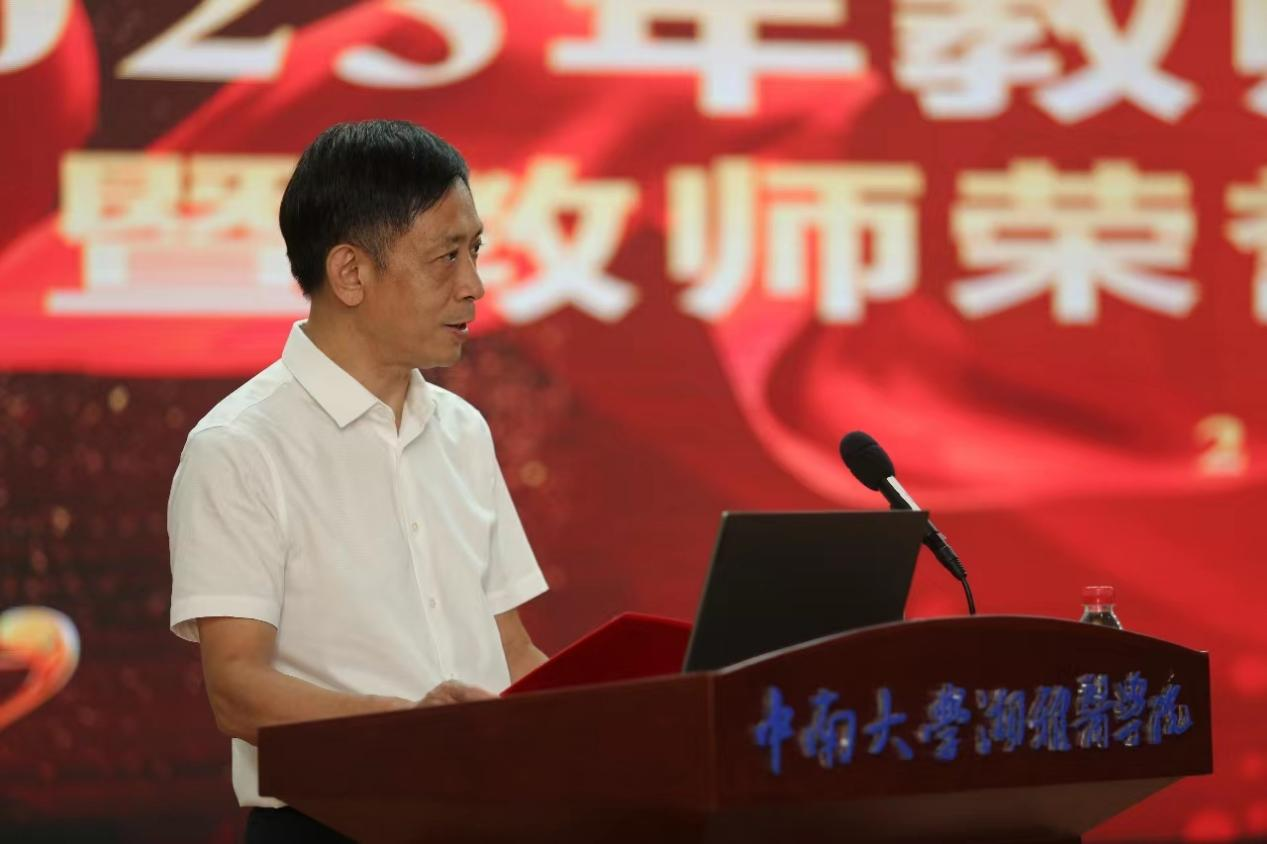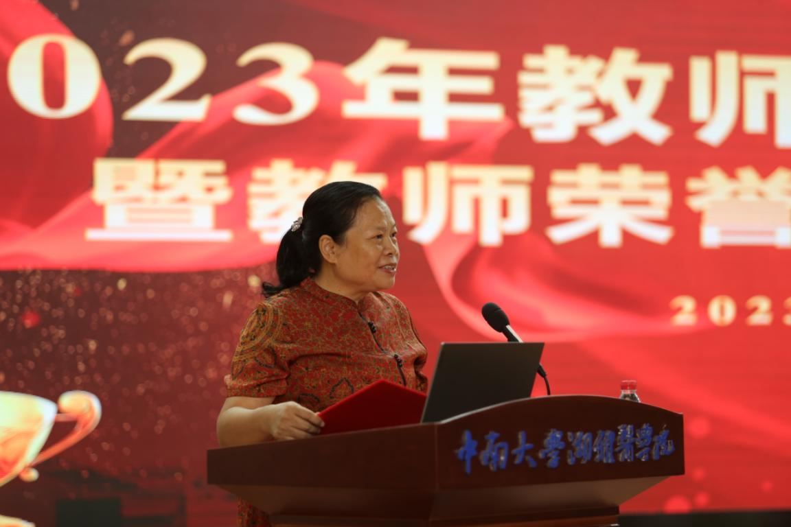 最后,管茶香副院长发表讲话。她表示,在授奖仪式上,既看到了德高望重、成就卓越的老前辈,也看到了热爱教育、锐意进取的新青年,这一“老”一“少”,一头连着“夕阳”,代表的是湘雅精神传承,一头连着“朝阳”,承载的是学院发展希望。她强调,广大教师要恪守教师职责、抱定报国志向,一是要为自己立德,做德为人先、行为世范的仁爱之师;二是要为学生立言,做授业解惑、传承学问的治学之师;三是要为国家立功,服务社会、兴医强国的实干之师。