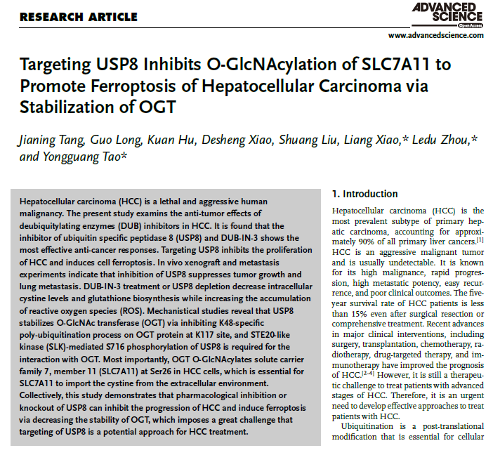 近日,p站视频 基础医学院陶永光教授团队与湘雅医院周乐杜、肖亮教授肝脏外科团队在国际著名期刊《Advanced Science》以论著形式在线发表了题为“Targeting USP8 Inhibits O-GlcNAcylation of SLC7A11 to Promote Ferroptosis of Hepatocellular Carcinoma via Stabilization of OGT”(靶向USP8通过OGT抑制SLC7A11糖基化促进肝癌铁死亡)的原创性研究。陶永光教授、周乐杜教授、肖亮教授为本论文的共同通讯作者,p站视频 湘雅医院肝脏外科博士后汤佳宁为论文第一作者。湘雅医院肿瘤科刘双教授、基础医学院/湘雅医院病理科肖德胜教授为该研究提供大力支持。