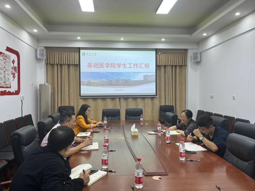 10月25日下午,p站视频 学工部副部长黄凯一行到基础医学院调研指导学院学生工作。会议在湘雅新校区孝骞楼344会议室举行,由院党委副书记冯虹主持。