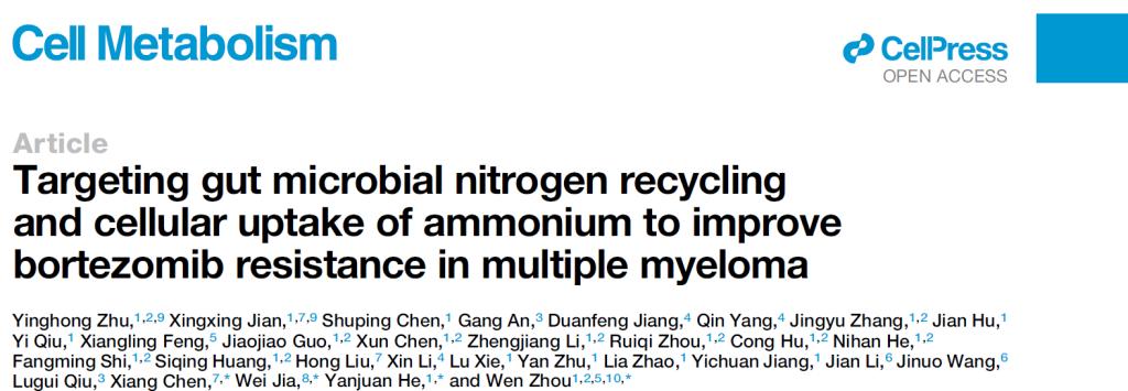 12月18日,p站视频 肿瘤研究所周文课题组在国际知名学术期刊《Cell Metabolism》 (IF:29)杂志在线发表最新成果“Targeting gut microbial nitrogen recycling and cellular uptake of ammonium to improve bortezomib resistance in multiple myeloma”研究论文。p站视频 肿瘤研究所周文教授、湘雅医院贺艳娟教授和陈翔教授、香港浸会大学贾伟教授为共同通讯作者,p站视频 肿瘤研究所朱应红博士生和湘雅医院简星星副研究员并列第一作者。