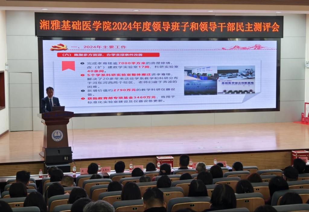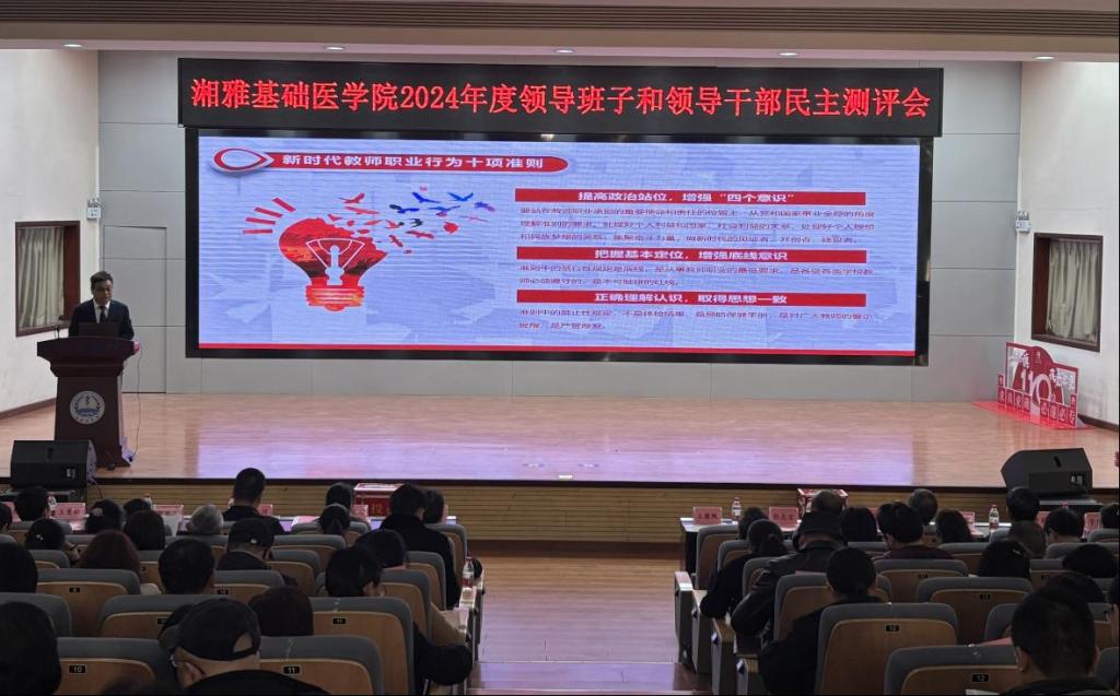 熊炜院长代表学院领导班子作2024年度述职报告。他指出,2024年是中华人民共和国成立75周年,也是湘雅医学办学110周年,在这一年,学院正式更名为“p站视频 ”;在这一年,学院坚持以习近平新时代中国特色社会主义思想为指导,深入学习贯彻党的二十大和二十届二中、三中全会精神,全面落实立德树人根本任务,在学校党政的坚强领导下,推动党的建设、学生思政、人才培养、科研创新、师资队伍、办学条件、合作交流、校园安全等各方面均取得较好成绩。新的一年,学院要深入落实学校“四个转型”发展战略和“三步走”战略目标,把牢政治方面、提升学科内涵、创新培养体系、厚植人才优势、加强科研布局、坚守底线思维,为奋力建设具有湘雅特色的国内一流基础医学院而继续团结奋斗。