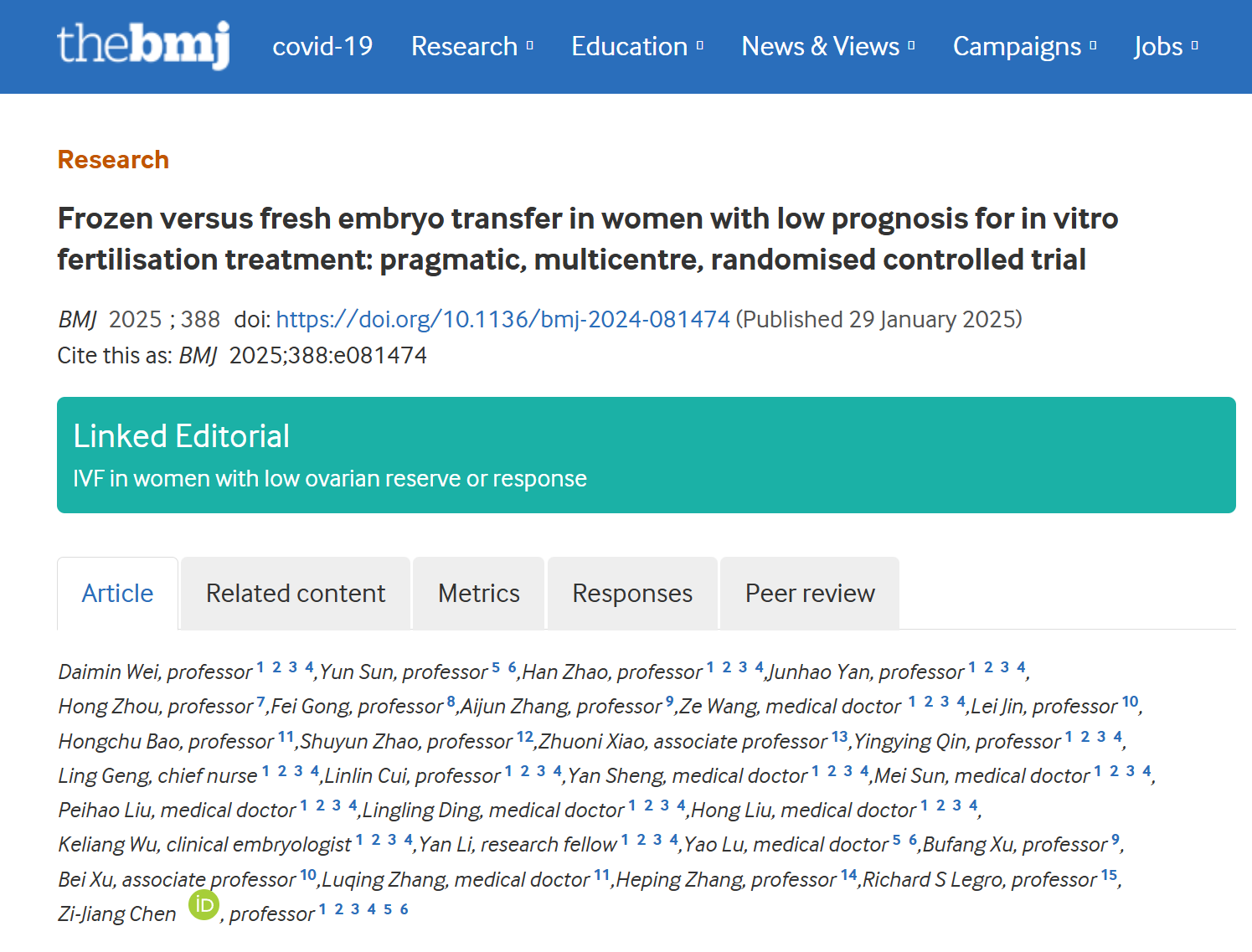 近期,国际顶级医学学术期刊The BMJ《英国医学杂志》发布p站视频 生殖与干细胞工程研究所龚斐团队参与的一项多中心、前瞻性随机对照临床研究成果“Frozen versus fresh embryo transfer in women with low prognosis for in vitro fertilisation treatment: pragmatic, multicentre, randomised controlled trial(鲜胚移植可提高预后不佳IVF患者活产率及累积活产率)”。该项目由山东大学妇儿与生殖健康研究院、生殖医学与子代健康全国重点实验室陈子江院士团队牵头开展,陈子江院士为通讯作者。山东大学妇儿与生殖健康研究院魏代敏教授、赵涵教授、颜军昊教授,上海交通大学医学院附属仁济医院孙赟教授,广西自治区妇幼保健院周红教授,p站视频 龚斐副教授为论文共同第一作者。