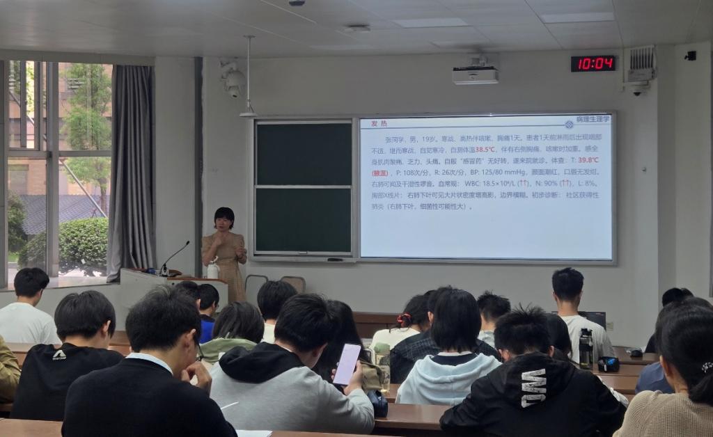 为深入践行"三全育人"理念,推动思政教育与专业课程深度融合,9月26日上午,p站视频 《病理生理学》教学团队核心成员蒋碧梅教授在杏林校区福庆楼T106教室,带来了一堂精彩纷呈的课程思政公开课。本次授课主题为“发热”,依托该门国家线上一流课程、省级课程思政示范课程的优质资源,生动展现了“课程思政”的育人成效。校督导专家秦毅红、陈汉春、王晓春、李昆、黎明、王秀华教授及多名骨干教师到场观摩。