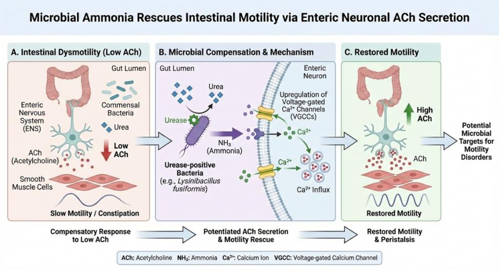 肠道蠕动是维持消化吸收和代谢稳态的关键生理过程,其核心调控依赖于肠神经系统释放的兴奋性神经递质乙酰胆碱。临床研究表明,慢性便秘等肠道动力障碍患者常伴随乙酰胆碱释放不足,但肠道微生物是否参与以及如何介入这一过程,长期缺乏明确机制解释。氨作为肠道内含量最为丰富的微生物代谢产物之一,传统上被视为代谢废物甚至神经毒性分子,其潜在的生理调控作用尚未得到系统认识。