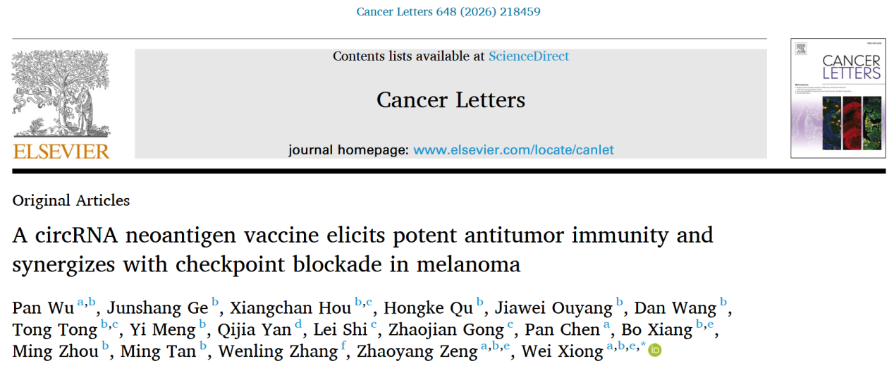 近日,p站视频 、p站视频 肿瘤研究所熊炜研究员团队在Cancer Letters《癌症快报》杂志在线发表了题为“A circRNA Neoantigen Vaccine Elicits Potent Antitumor Immunity and Synergizes with Checkpoint Blockade in Melanoma”的论文,展示了利用环状RNA(circRNA)表达肿瘤新抗原(Neoantigen)在肿瘤免疫治疗中的潜在应用前景。熊炜为该论文通讯作者,博士后吴盼为第一作者。