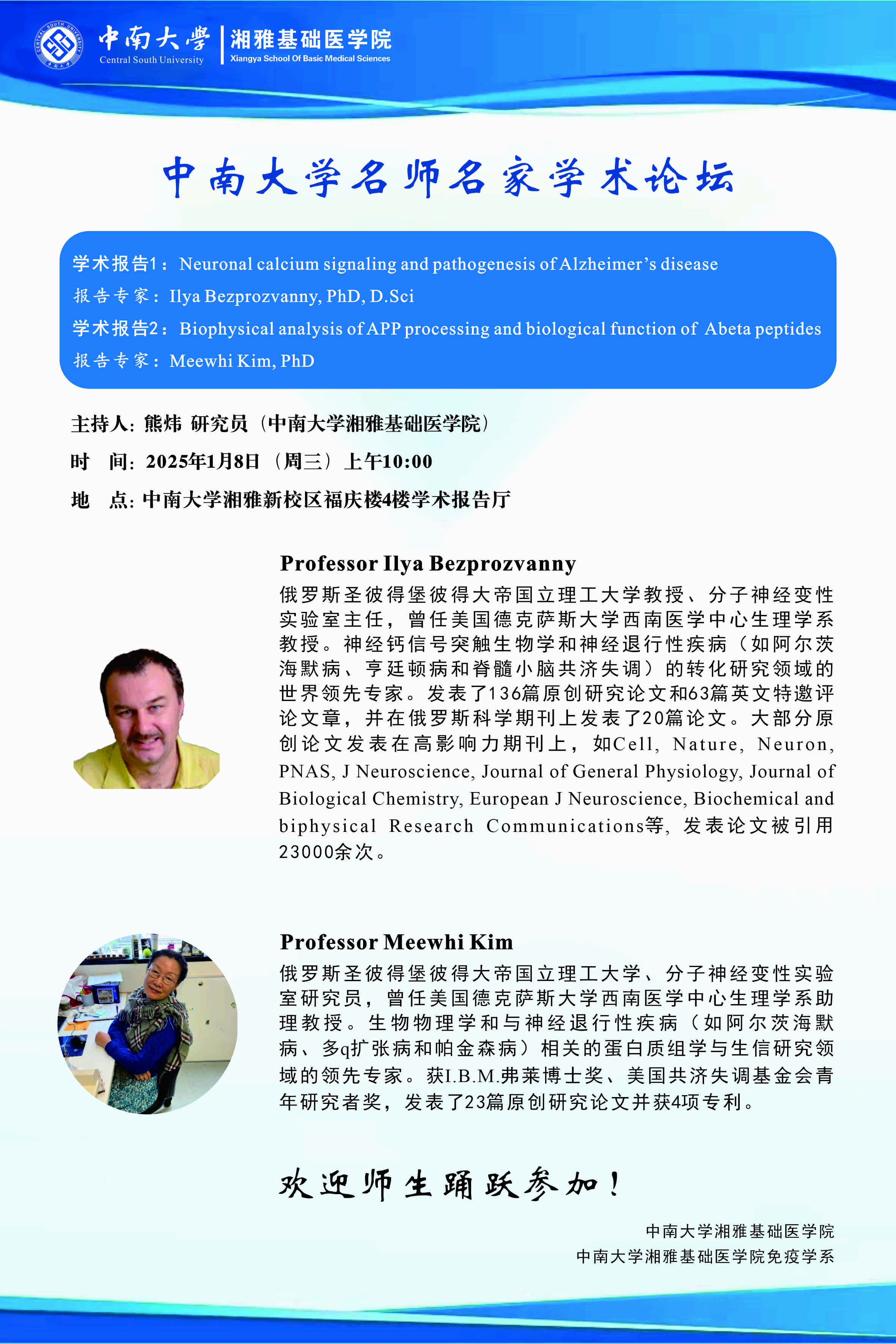 Ilya Bezprozvanny,Meewhi Kim p站视频 湘雅新校区福庆楼4楼学术报告厅 2025年01月06日 10:54 浏览次数: