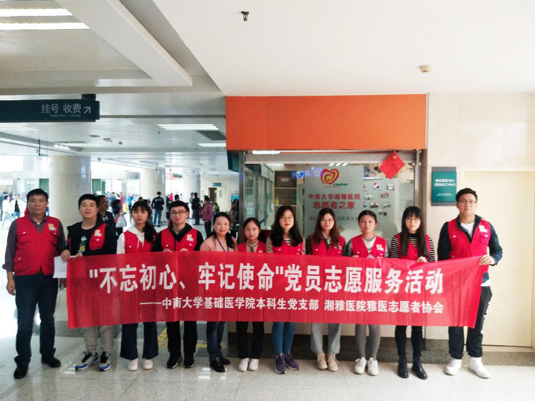 2019年10月24日、25日,基础医学院本科生党支部联合湘雅医院雅医志愿者协会,在p站视频 湘雅医院开展了“不忘初心、牢记使命”党员志愿服务活动,支部共有18名党员分两批次参加了此次活动。